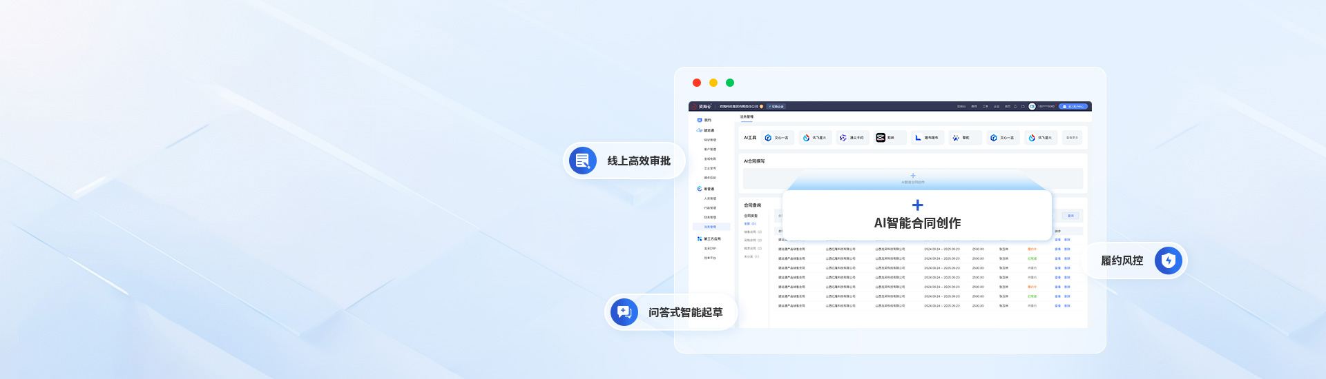 法務管理系統(tǒng)深度融合AI技術,覆蓋從智能撰寫、在線審批、審查校對、風險預警至歸檔管理的合同全階段管理,確保流程標準化與數(shù)據流通無阻。AI問答智能合同生成,極大優(yōu)化了合同起草流程,有效提升工作效率、規(guī)避合同法律風險。以企業(yè)需求為核心,為企業(yè)法務管理帶來高效、便捷與安全的全新體驗。